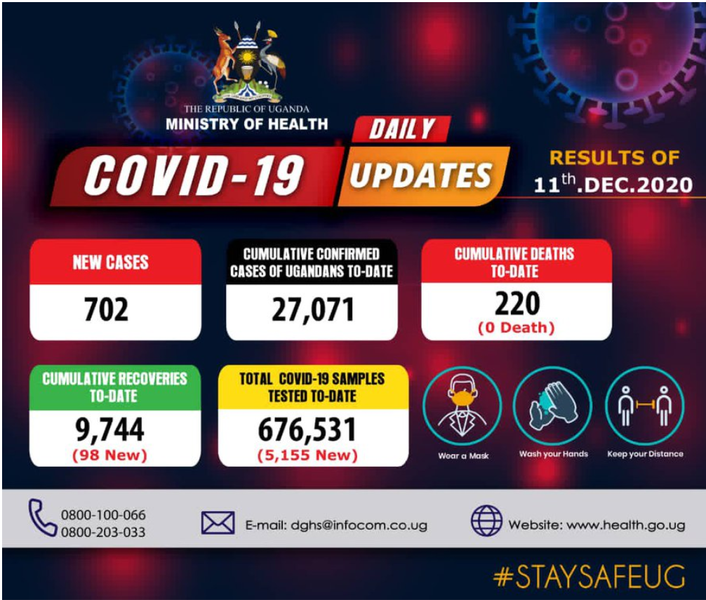 Results of COVID-19 tests done on 11 December 2020 confirm 702 new cases bringing the total number of cumulative confirmed cases to 27,071.